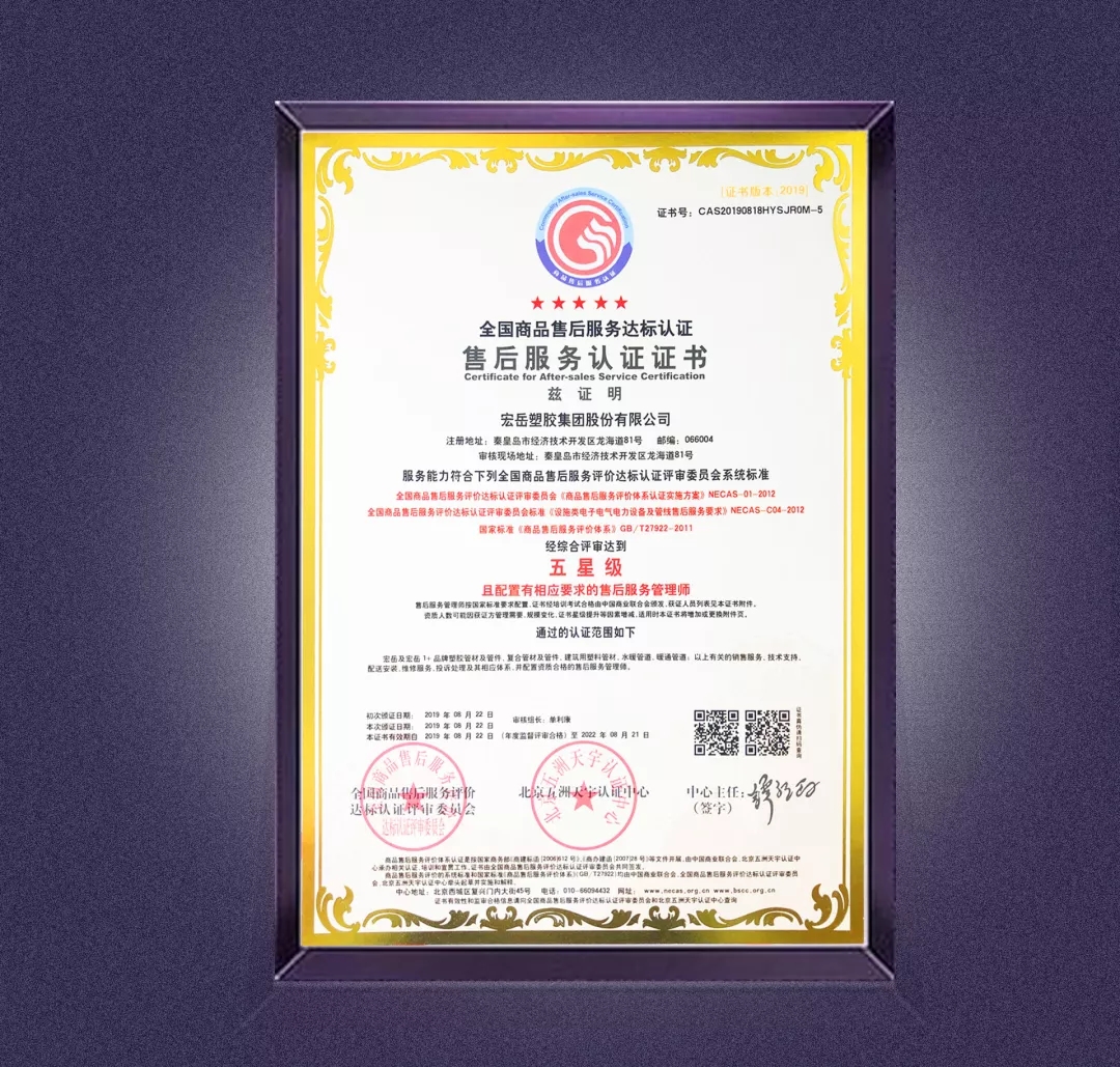 8月22日,乐鱼(中国)leyu塑胶集团股份有限公司通过全国商品售后服务达标认证,获得五星级售后服务认证证书。